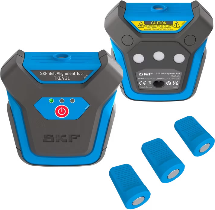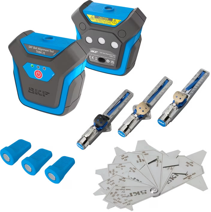 A ferramenta tem dois componentes: uma unidade de transmissão de laser e uma unidade receptora. Cada um deles é fixado de forma rápida e fácil - usando um ímã potente - na face interna ou externa de uma polia de correia ou de uma roda dentada de corrente. O TKBA 31 pode ser aplicado à maioria das máquinas que usam correias em V, correias com faixas e correias com nervuras, bem como àquelas com engrenagens de corrente. Uma linha de laser é projetada do transmissor para o receptor, que é montado na polia oposta. Em seguida, a ferramenta corrige o ângulo vertical, o ângulo horizontal e o desalinhamento paralelo, inclusive as combinações dos três.