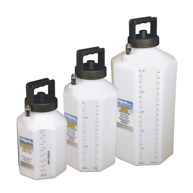 A Mityvac oferece reservatórios de 5, 10 e 20 litros para armazenar fluidos ou para aumentar a capacidade dos modelos MV6400 e MV6410. Cada reservatório inclui uma tampa e um tubo coletor de fluido, com acoplador de troca rápida para conexão de acessórios MV6400 e MV6410.